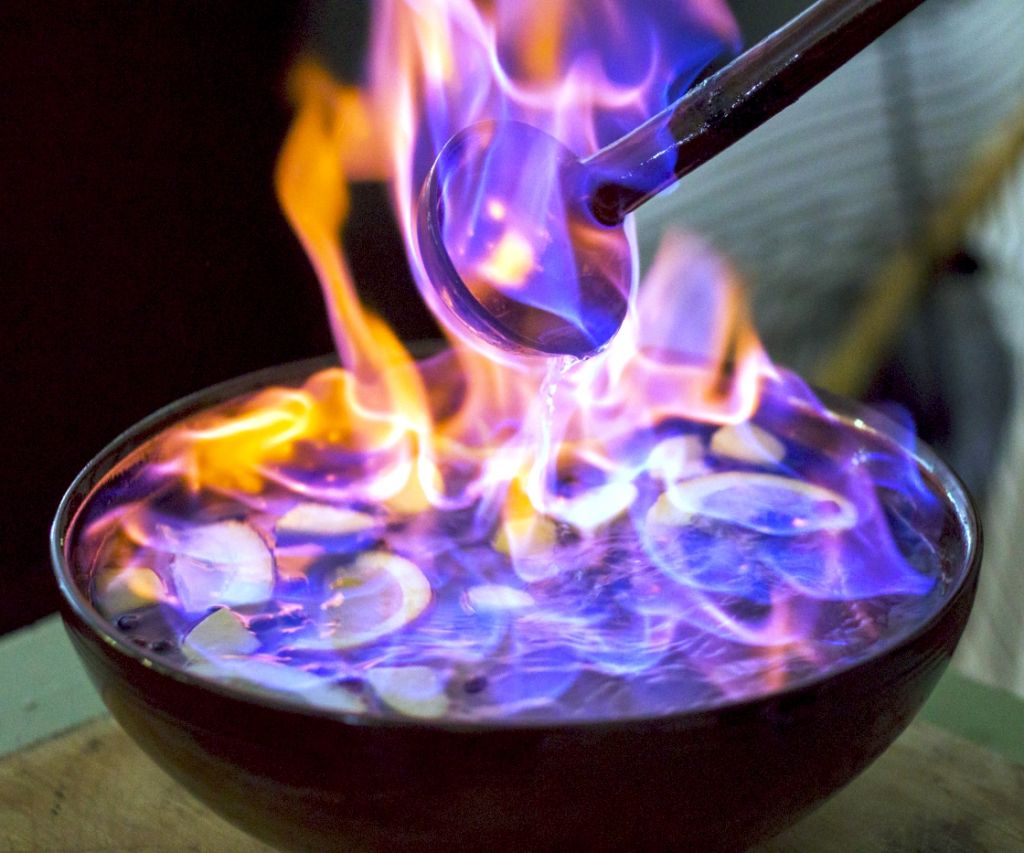 4. Una vez que la queimada se haya quemado por completo, utiliza el cucharón para servir la queimada en vasos pequeños.